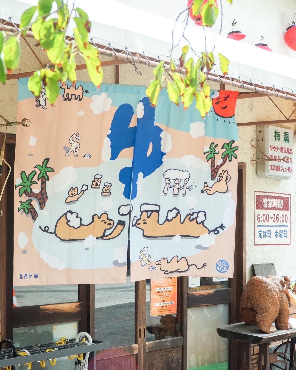 この度、コラボ暖簾を製作しました。デザインは鴨川湯の店長でイラストレーターのさくらこちゃん Instgagram @oekaki_sakuracochan 。皆様石鹸を象徴するラクダたちが砂漠でお風呂に入っているデザインです。梅湯、容輝湯、鴨川湯、湊河湯、パール温泉でご覧いただけます。
